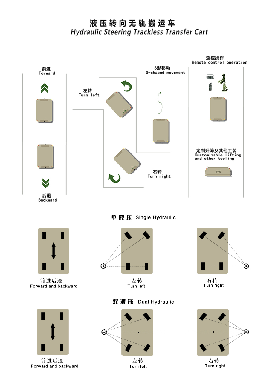 Industrial heavy load electric transfer cart differential steering trackless transfer cart is an important type of industrial transfer cart and one of the most important tool equipments in modern industrialized handling. Facing industrial progress, different field characteristics and market demands, trackless electric transfer carts continuously innovate technologies and various functions. Commonly, they are divided into differential steering, hydraulic steering, omnidirectional steering wheel, automated AGV, etc. All steering methods and requirements are customized according to application scenarios and usage requirements. Let your handling be closer to practicality, simplicity, and humanity.